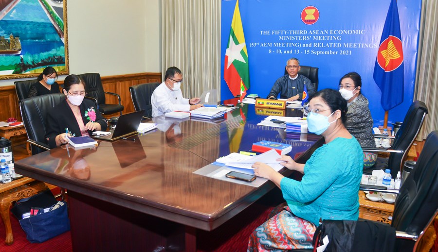Union Minister for Investment and Foreign Economic Relations U Aung Naing Oo attended to the AEM-United States Trade Representative Consultations, 5th AEM-Hong Kong Consultations, 18th AEM-India Consultations, 17th AEM-EU Trade Commissioner Consultations and 10th AEM-Russia Consultations which were held via video conferencing started at 7:00 am from the Ministry of Investment and Foreign Economic Relations, Nay Pyi Taw.