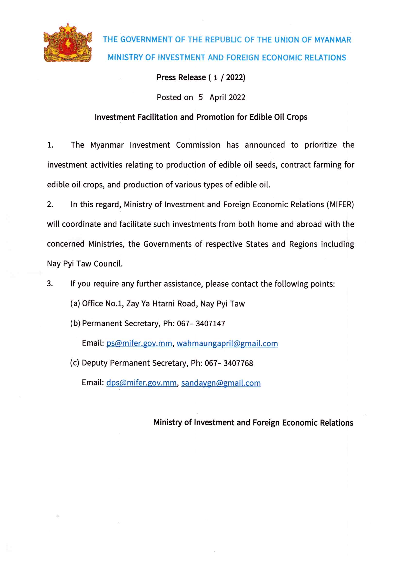 Press Release ( 1 / 2022) , Investment Facilitation and Promotion for Edible Oil Crops |