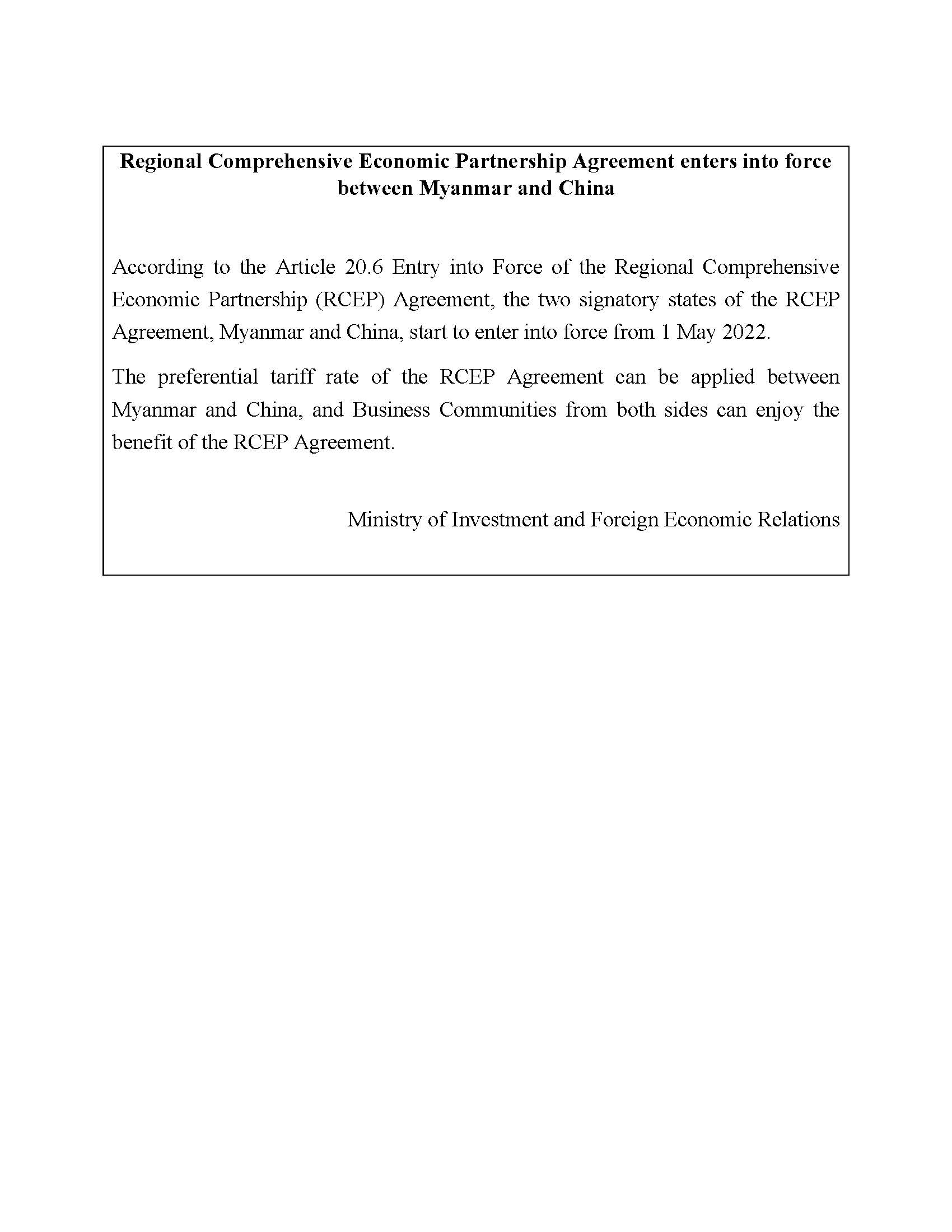Regional Comprehensive Economic Partnership Agreement enters into force between Myanmar and China |