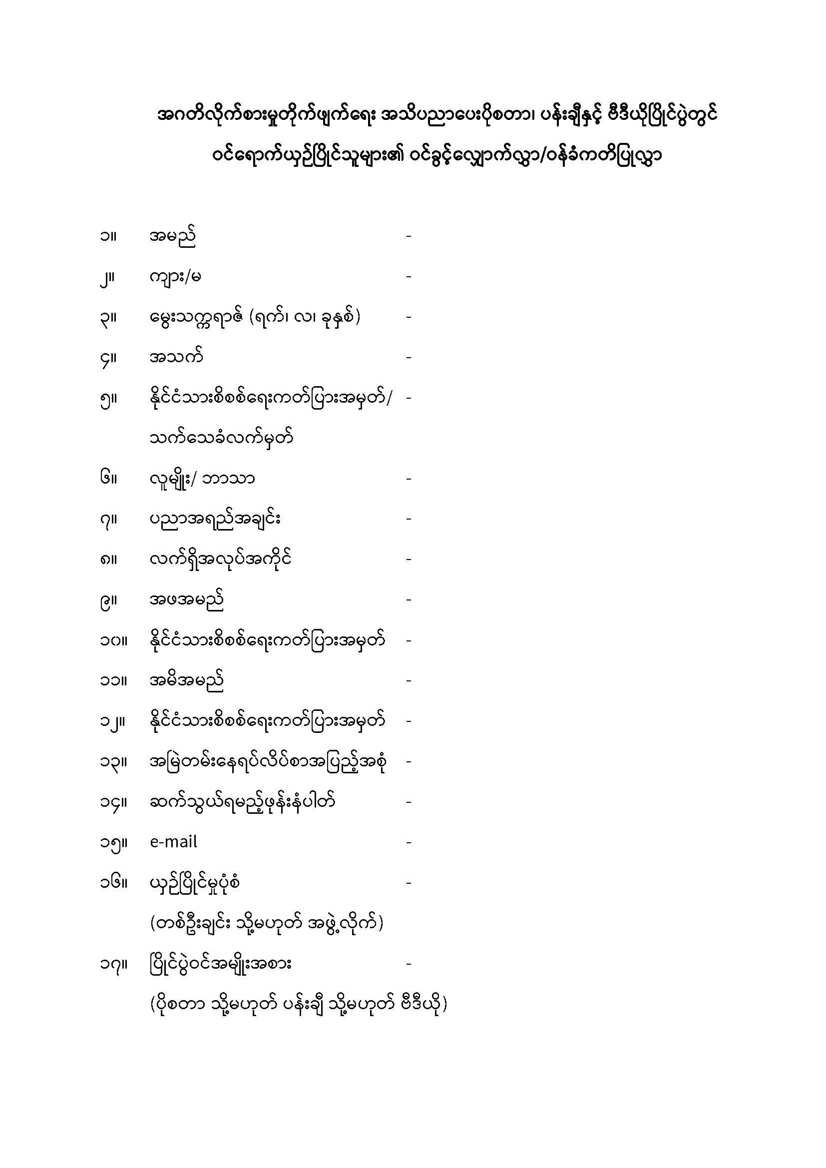 (ဃ) ပြိုင်ပွဲဝင်များအနေဖြင့် ပြိုင်ပွဲဝင်ခွင့်လျှောက်လွှာပါအချက်များကို မှန်ကန်စွာ ဖြည့်စွက်ပေးပို့ရမည်၊