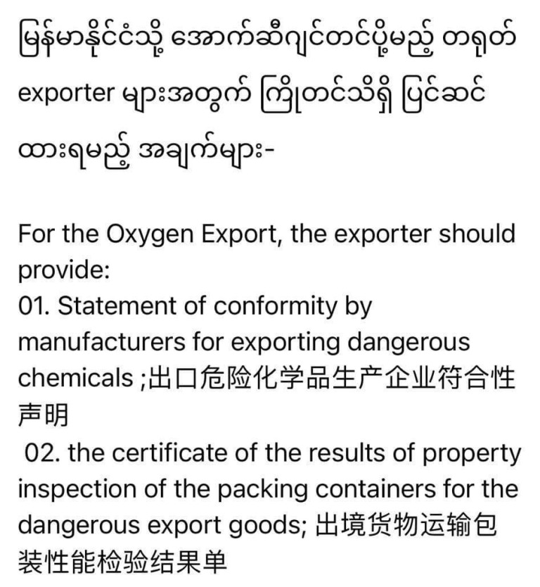 မြန်မာနိုင်ငံသို့ အောက်ဆီဂျင်တင်ပို့မည့် တရုတ် exporter များအတွက် ကြိုတင်သိရှိပြင်ဆင်ထားရမည့်အချက်များ Post on 20 July 2021