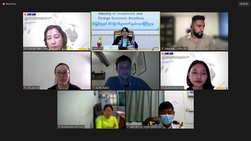 အာဆီယံ-ဩစတြေးလျ၊ နယူးဇီလန် လွတ်လပ်သော ကုန်သွယ်မှုဒေသအောက်ရှိ အကောက်ခွန်ဆိုင်ရာ အကျိုးခံစားခွင့်များအသုံးပြုခြင်းအပေါ် စောင့်ကြည့်လေ့လာခြင်း စီမံချက် နှင့်စပ်လျဉ်း၍ အမျိုးသားအဆင့် အလုပ်ရုံ ဆွေးနွေးပွဲကို ၂၀၂၂ ခုနှစ် ဖေဖော်ဝါရီလ ၇ ရက်နေ့တွင် ဗီဒီယိုကွန်ဖရင့်စနစ်ဖြင့် နိုင်ငံခြားစီးပွားဆက်သွယ်ရေးဦးစီးဌာနနှင့် အာဆီယံ အတွင်းရေးမှူးချုပ် ရုံးတို့ ပူးပေါင်းကျင်းပခဲ့သည်။