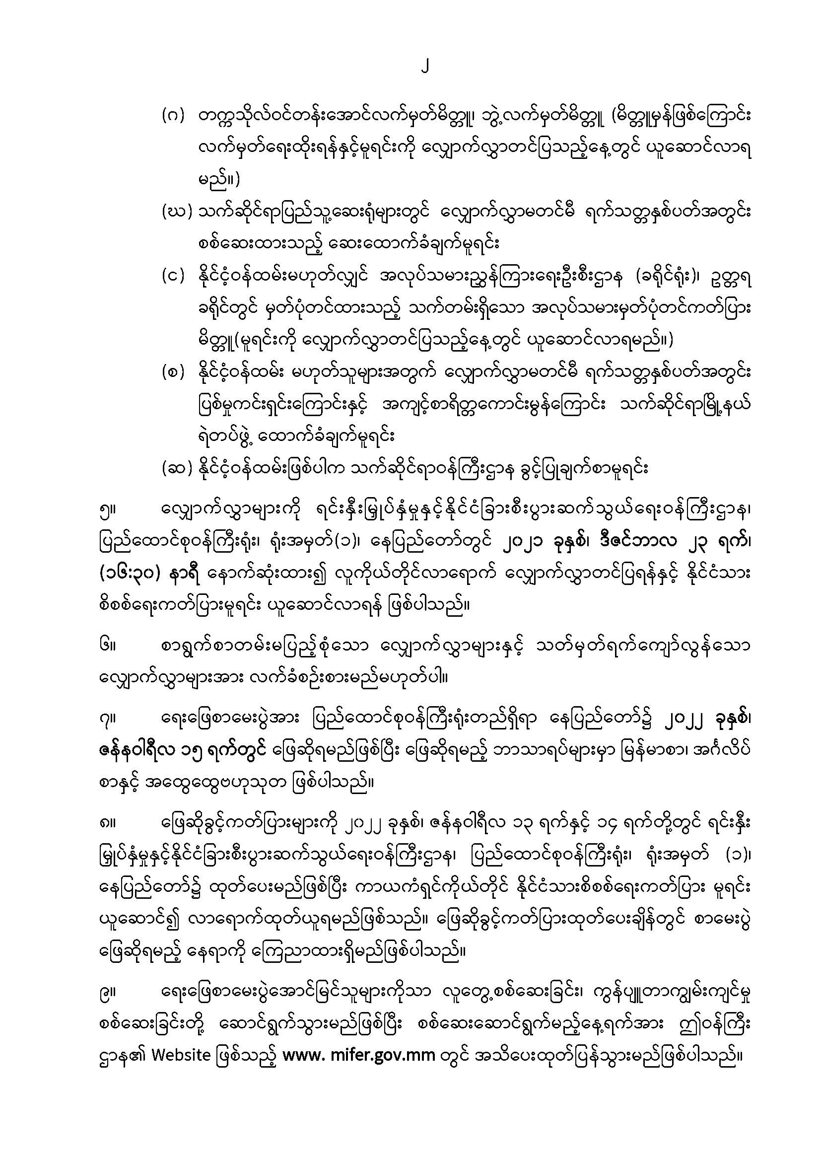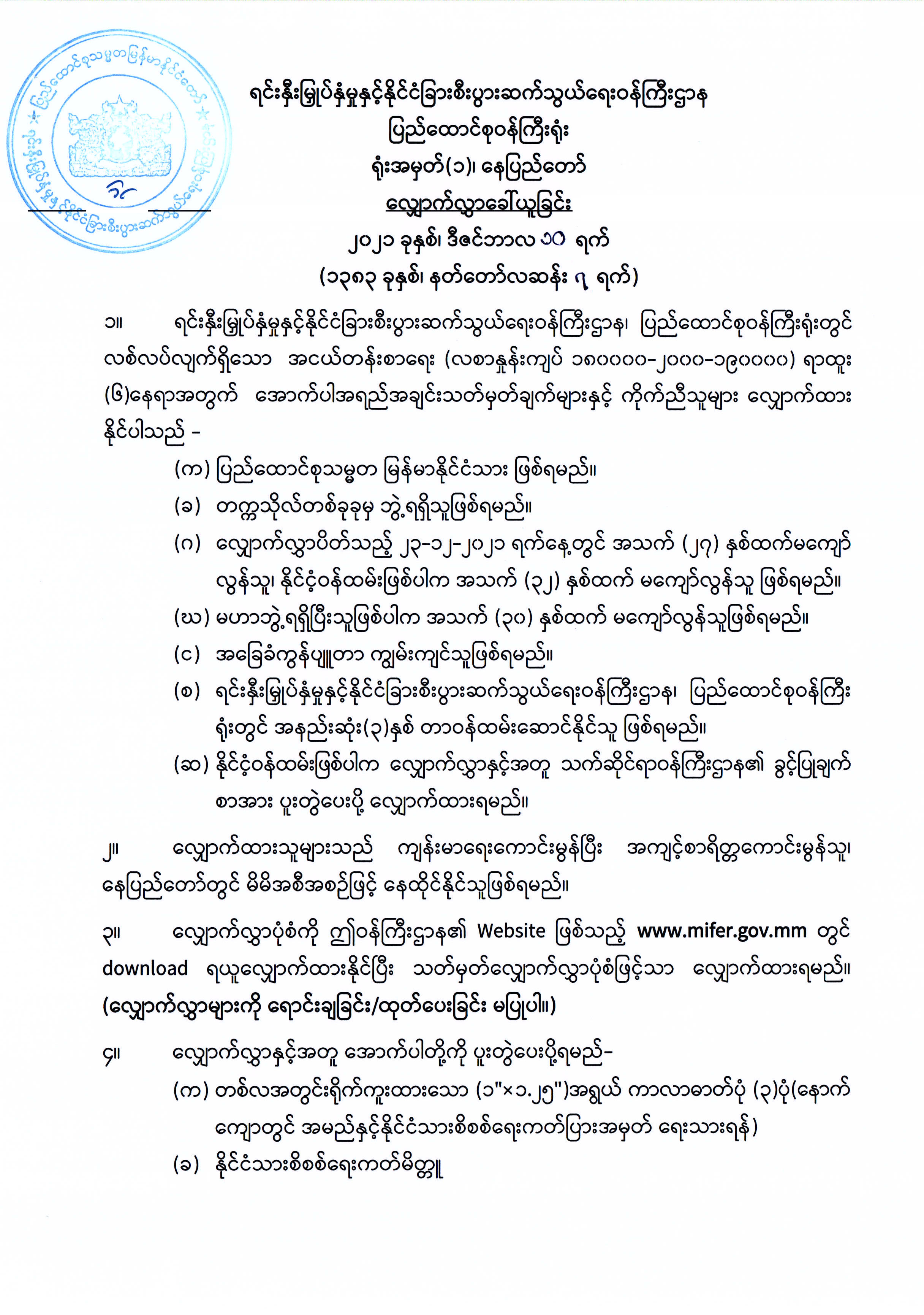 ရင်းနှီးမြှုပ်နှံမှုနှင့် နိုင်ငံခြားစီးပွားဆက်သွယ်ရေးဝန်ကြီးဌာန၊ ပြည်ထောင်စုဝန်ကြီးရုံးတွင် လစ်လပ်လျက်ရှိသော အငယ်တန်းစာရေး လျှောက်လွှာခေါ်ယူခြင်း Post on 13 December 2021 ကြေညာချက်အပြည့်အစုံကို download ရယူနိုင်ပါသည်>>>