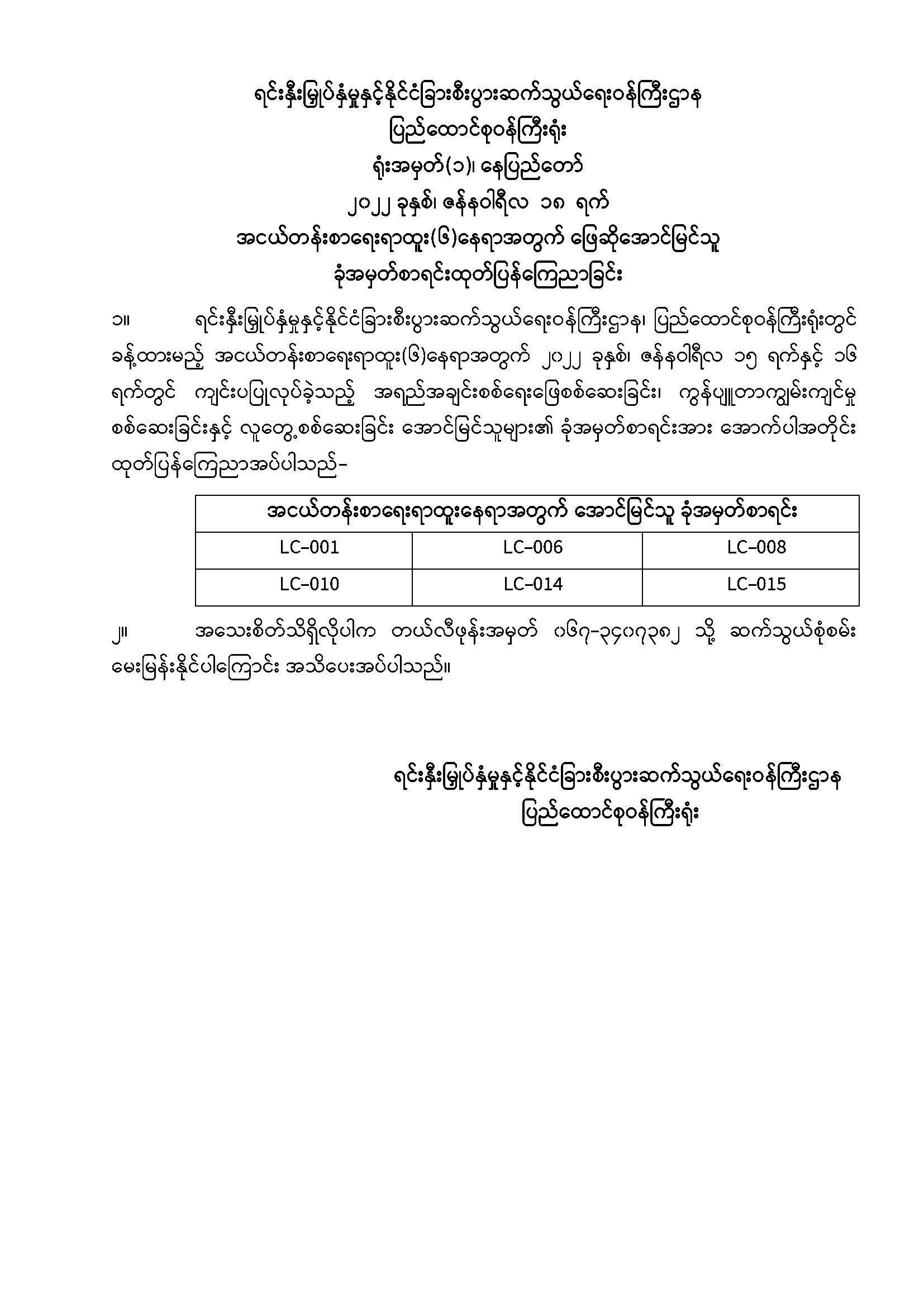 အငယ်တန်းစာရေးရာထူး (၆) နေရာအတွက် ဖြေဆိုအောင်မြင်သူခုံအမှတ်စာရင်းထုတ်ပြန်ကြေညာခြင်း Post on 18 January 2022