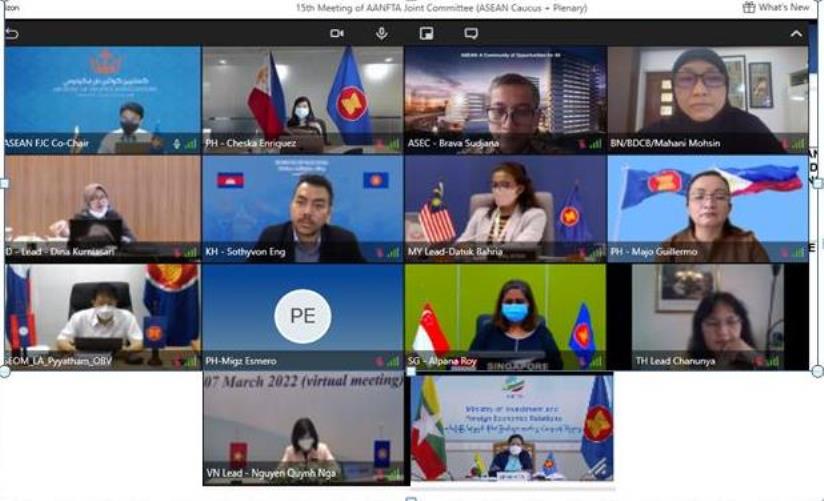 ၂၀၂၂ ခုနှစ်၊ မတ်လ ၇ ရက်နေ့တွင် ဗီဒီယိုကွန်ဖရင့်ဖြင့် ကျင်းပသည့် (၁၅) ကြိမ်မြောက် အာဆီယံ-ဩစတြေးလျ၊ နယူးဇီလန် လွတ်လပ်သော ကုန်သွယ်မှုဒေသ ပူးတွဲကော်မတီ အစည်းအဝေးသို့ ရင်းနှီးမြှုပ်နှံမှုနှင့် နိုင်ငံခြားစီးပွားဆက်သွယ်ရေးဝန်ကြီးဌာန၊ အမြဲတမ်းအတွင်းဝန်၊ ဒေါက်တာဝါဝါမောင် ဦးဆောင်၍ ဘာသာရပ်ဆိုင်ရာ ကိုယ်စားလှယ်များ ပါဝင်တက်ရောက် ခဲ့ပါသည်။