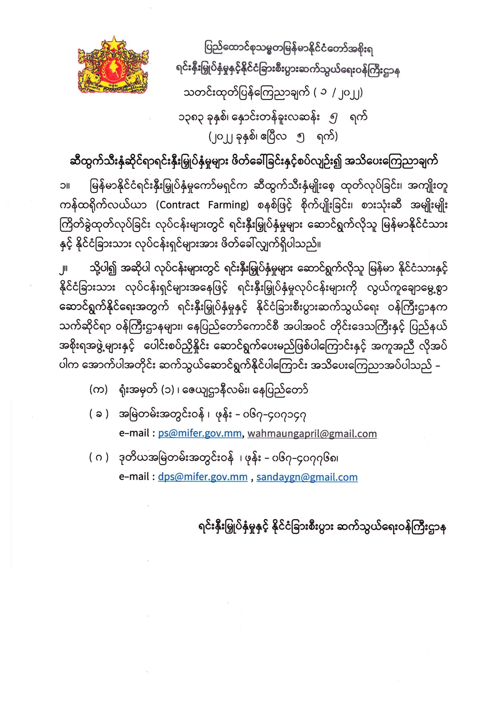 ဆီထွက်သီးနှံဆိုင်ရာရင်းနှီးမြှုပ်နှံမှုများ ဖိတ်ခေါ်ခြင်းနှင့်စပ်လျဉ်း၍ အသိပေးကြေညာချက် Post on 06 April 2022