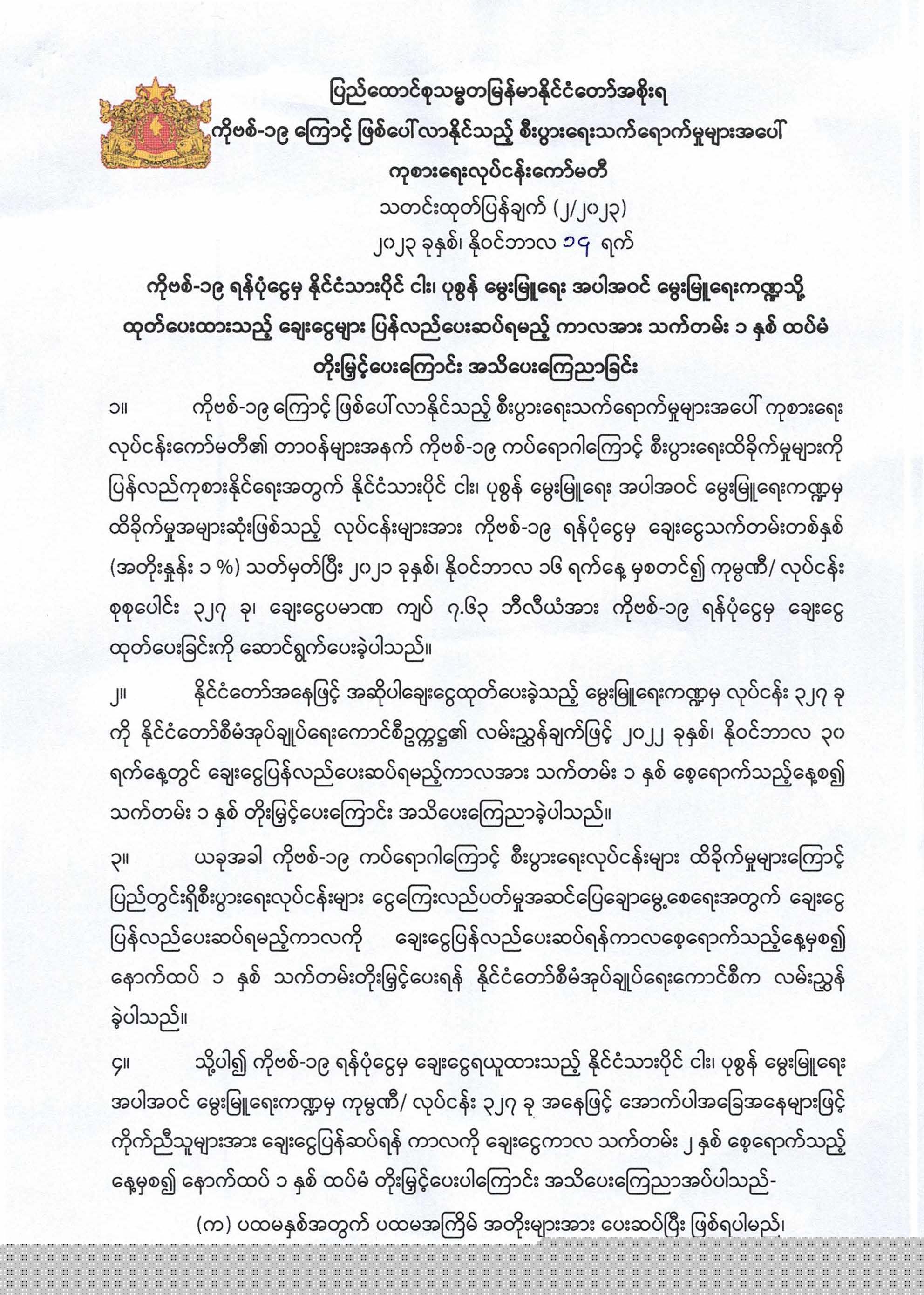 ကိုဗစ်-၁၉ ရန်ပုံငွေမှ နိုင်ငံသားပိုင် ငါး၊ ပုစွန် မွေးမြူရေး အပါအဝင် မွေးမြူရေးကဏ္ဍသို့ ထုတ်ပေးထားသည့် ချေးငွေများ ပြန်လည်ပေးဆပ်ရမည့် ကာလအား သက်တမ်း ၁ နှစ် ထပ်မံ တိုးမြှင့်ပေးကြောင်း အသိပေးကြေညာခြင်း Post on 15 November 2023