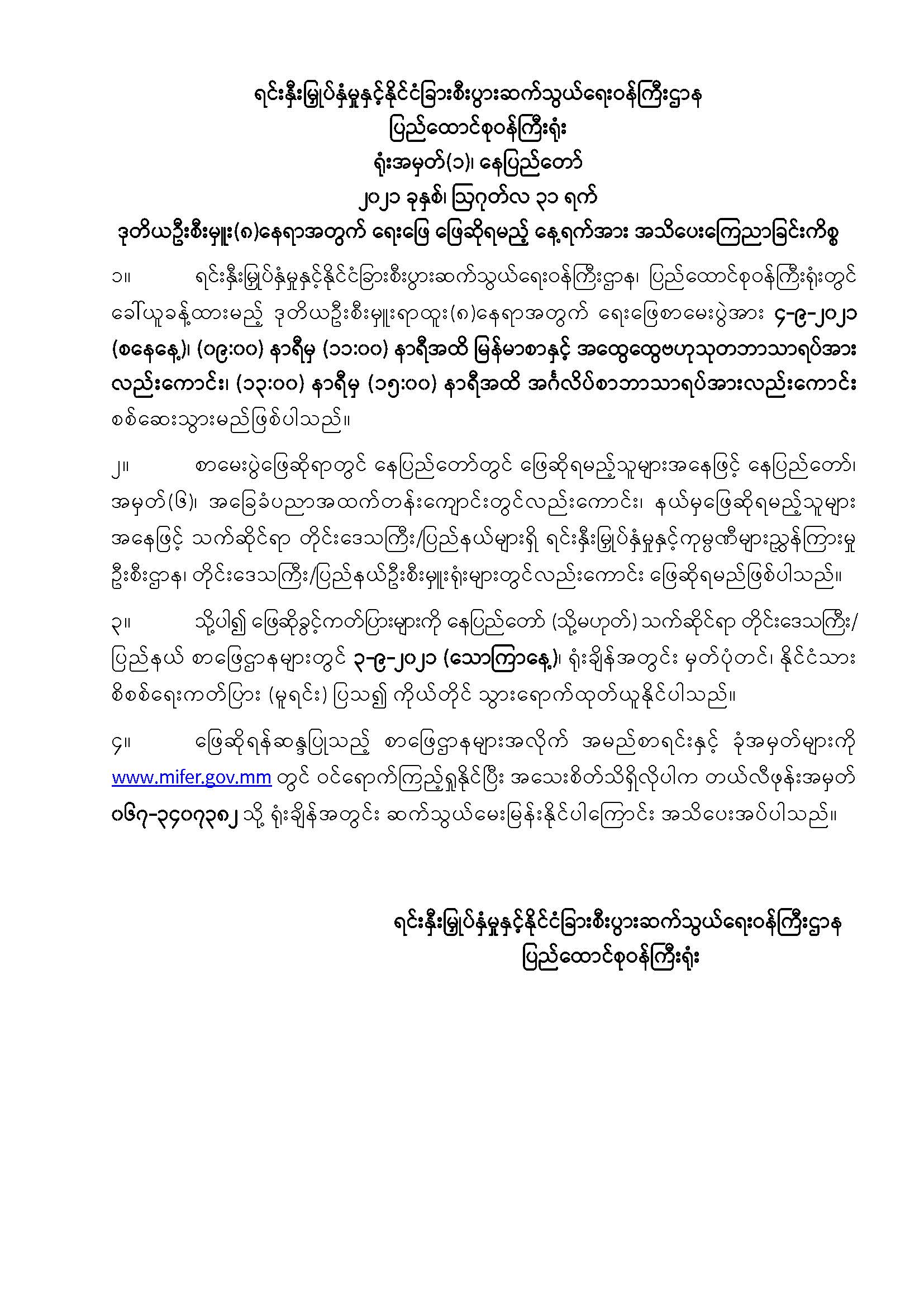 ရင်းနှီးမြှုပ်နှံမှုနှင့် နိုင်ငံခြားစီးပွားဆက်သွယ်ရေးဝန်ကြီးဌာန၊ ပြည်ထောင်စုဝန်ကြီးရုံးတွင် လစ်လပ်လျက်ရှိသည့် ဒုတိယဦးစီးမှူး(၈) နေရာ ခန့်အပ်နိုင်ရေးအတွက် ဖြေဆိုရမည့် စာစစ်ဌာနနှင့် ခုံအမှတ်စာရင်းများ ကြေညာခြင်း