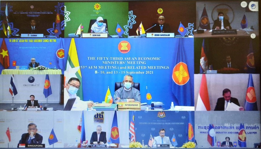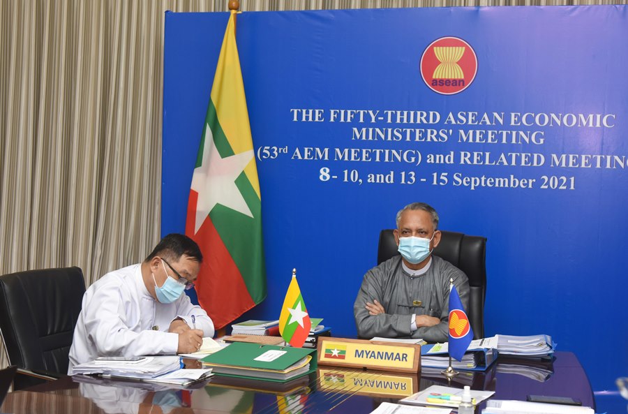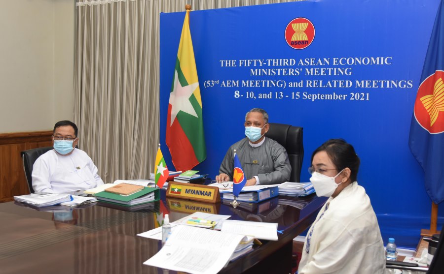 ထို့နောက် ညနေပိုင်းတွင် (၅၃)ကြိမ်မြောက် အာဆီယံစီးပွားရေးဝန်ကြီးများ အစည်း အဝေးကို ကျင်းပခဲ့ရာ ဝန်ကြီးများက နိုင်ငံအလိုက် ကိုဗစ်-၁၉ ရောဂါ ကာကွယ်၊ ထိန်းချုပ်၊ ကုသမှု၊ ကာကွယ်ဆေး ထိုးနှံမှု အခြေအနေများကို ဆွေးနွေးခဲ့ကြပြီး၊ ပြည်ထောင်စုဝန်ကြီးက မြန်မာနိုင်ငံတွင် ၂၀၂၁ ခုနှစ်ကုန်၌ ကာကွယ်ဆေးထိုးနှံရန် အကြုံးဝင်သည့် လူဦးရေ၏ ၅၀ရာခိုင်နှုန်းအား ကာကွယ်ဆေးထိုးနှံပေးနိုင်ရေးအတွက် ဆောင်ရွက်နေမှုများ၊ ရောဂါဖြစ်ပွားနေစဉ် အတွင်း မရှိမဖြစ် လိုအပ်သည့် ဆေးဝါးများနှင့် ဆေးကိရိယာများကို လွယ်ကူစွာ တင်သွင်း၊ ဖြန့်ဖြူးနိုင်ရေး ဆောင်ရွက်မှုများကို ရှင်းလင်း ပြောကြားခဲ့ပါသည်။ (၅၃)ကြိမ်မြောက် အာဆီယံစီးပွားရေးဝန်ကြီးများ အစည်းအဝေးကို စက်တင်ဘာလ ၉ ရက်နေ့တွင် ဆက်လက် ကျင်းပမည်ဖြစ်သည်။