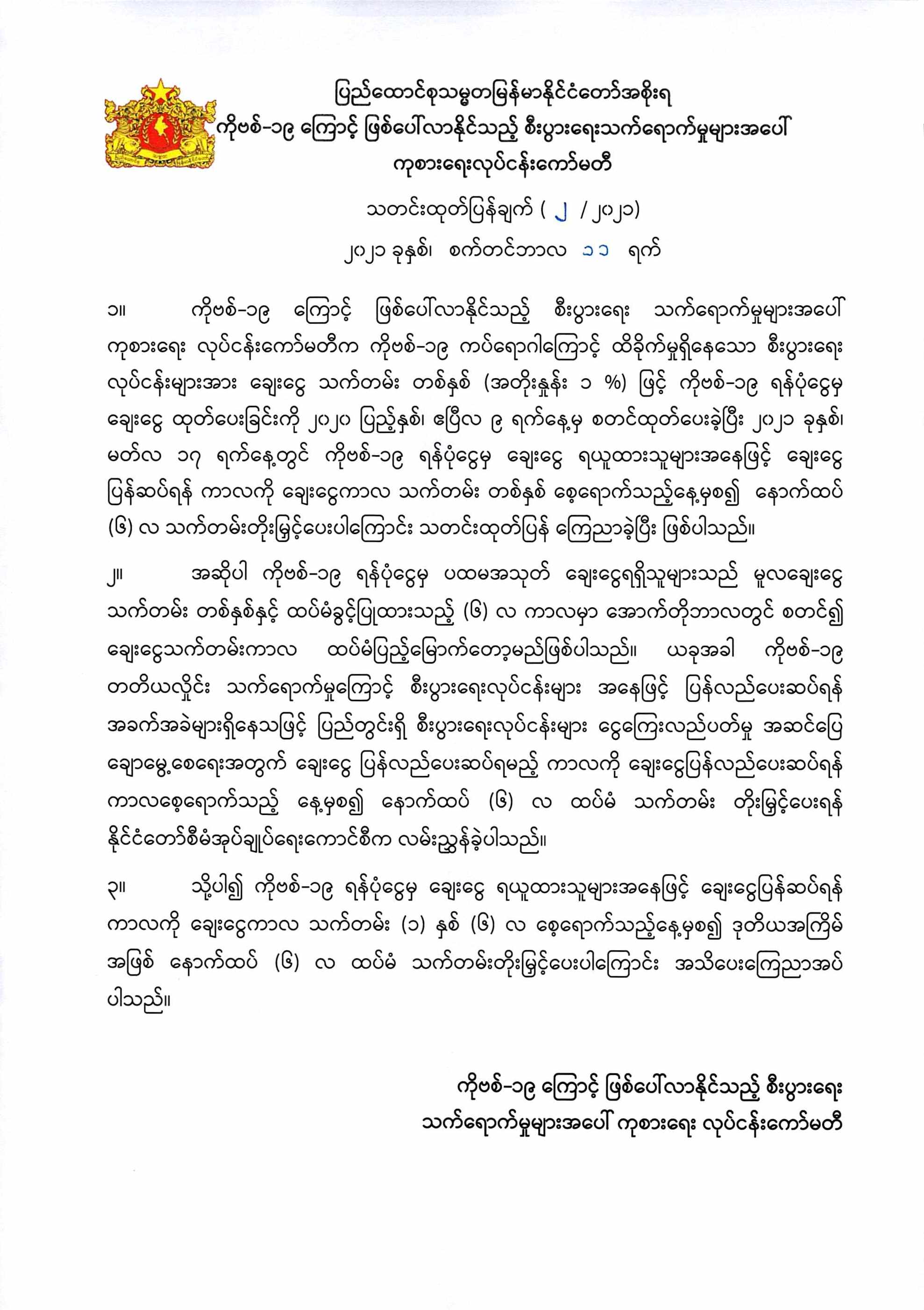 ကိုဗစ်-၁၉ ကြောင့် ဖြစ်ပေါ်လာနိုင်သည့် စီးပွားရေး သက်ရောက်မှုများအပေါ် ကုစားရေး လုပ်ငန်းကော်မတီ သတင်းထုတ်ပြန်ချက်(၂/၂၀၂၁) ထုတ်ပြန်ကြေညာ Post on 11 September 2021