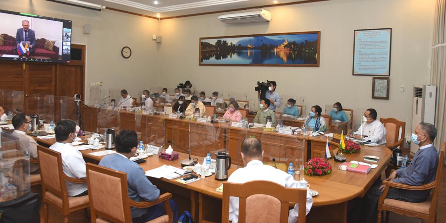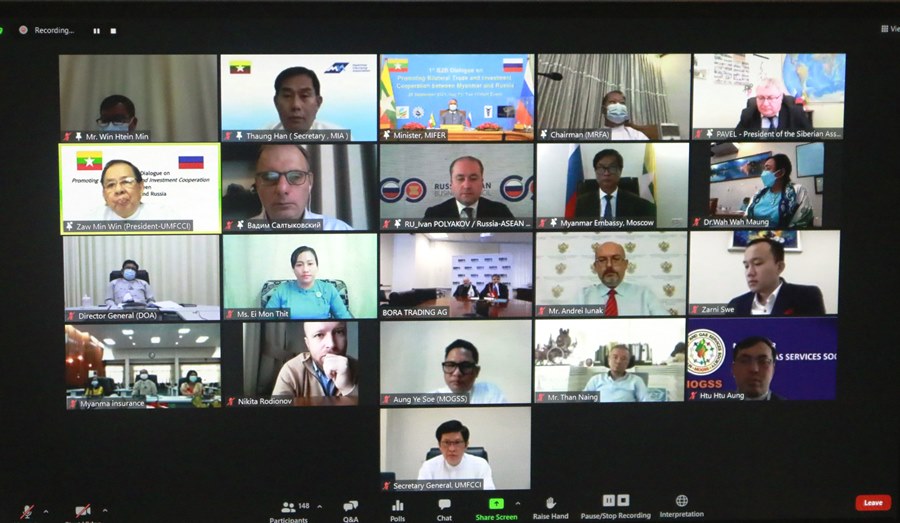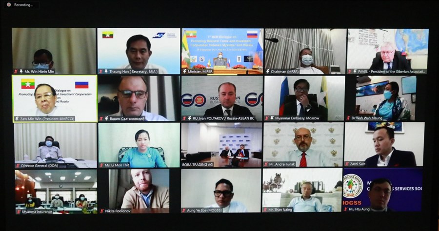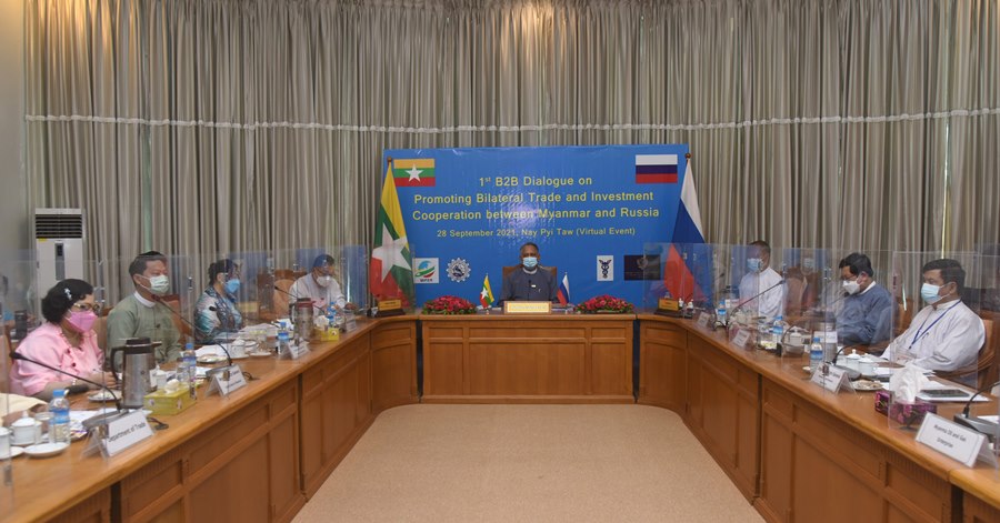 မြန်မာ-ရုရှား နှစ်နိုင်ငံအကြား ကုန်သွယ်မှုနှင့်ရင်းနှီးမြှုပ်နှံမှုများ ပိုမိုတိုးမြှင့်လာစေရန် ရည်ရွယ်၍ ပထမအကြိမ် မြန်မာ-ရုရှား စီးပွားရေးလုပ်ငန်းရှင်များ ဆွေးနွေးပွဲ (1st Business to Business Dialogue) ကို ၂၀၂၁ ခုနှစ်၊ စက်တင်ဘာလ ၂၈ ရက်နေ့ ၁၃:၃၀ နာရီတွင် ရုံးအမှတ်(၁)၊ ရင်နှီးမြှုပ်နှံမှုနှင့် နိုင်ငံခြားစီးပွားဆက်သွယ်ရေးဝန်ကြီးဌာန၊ အစည်းအဝေးခန်းမ၊ နေပြည်တော် တွင် Virtual စနစ်ဖြင့် ကျင်းပပြုလုပ်ခဲ့သည်။