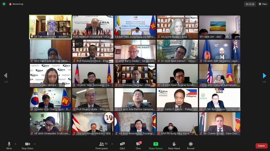 အစည်းအဝေးတွင် အီးအာရ်အိုင်အေ၏ Chief Operation Officer Mr. KoJi Hachiyama က ၂၀၂၁ ဘဏ္ဍာနှစ်နှင့် ၎င်းကာလ အလွန်အတွက် အီးအာရ်အိုင်အေက ဆောင်ရွက်မည့် လုပ်ငန်းအစီအစဉ်များ ကိုလည်းကောင်း၊ Senior Economist Dr. Dionisius A. Narjoko က ၂၀၂၅ အလွန် အာဆီယံစီးပွားရေး အသိုက်အဝန်း လမ်းပြမြေပုံ ခိုင်မာစေရေးကို လည်းကောင်း၊ Senior Energy Economist Dr. Han Phoumin က အာဆီယံ ကာဗွန်လျော့ချရေးလုပ်ငန်းစဉ်များကို လည်းကောင်း ရှင်းလင်း တင်ပြခဲ့ကြပါသည်။