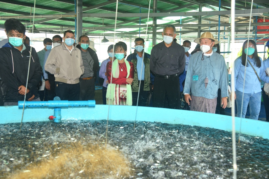 ပြည်ထောင်စုဝန်ကြီးနှင့် အဖွဲ့ဝင်များကို လုပ်ငန်းတာဝန်ရှိသူများက ကြိုဆိုနှုတ်ဆက် ကြပြီး ကုမ္ပဏီ၏ ဉက္ကဋ္ဌဖြစ်သူ ဉီးဌေးမြင့် က လုပ်ငန်းလည်ပတ်နေမှုအခြေအနေများ၊ ငါးသားပေါက် ထုတ်လုပ်မှု အခြေအနေများ၊ Modern Steel Tank နှင့် Eco and Smart Growout နည်းပညာသစ်အသုံးပြု၍ ငါးမွေးမြူ ထုတ်လုပ်မှု အခြေအနေများ၊ ငါးအစာ၊ ငါးပေါင်းမှုန့်၊ ငါးဆီ ထုတ်လုပ်နိုင်မှု အခြေအနေများ၊ ငါးအစာတောင့်နှင့် အအေးခန်းစက်ရုံ ဆောင်ရွက်နေမှု အခြေအနေများ၊ တွေ့ကြုံနေရသည့် အခက်အခဲများ၊ ဆက်လက် ဆောင်ရွက်မည့် ရင်းနှီးမြှုပ်နှံမှု ဆိုင်ရာ ကိစ္စရပ်များကို ဆွေးနွေးတင်ပြခဲ့ပါသည်။