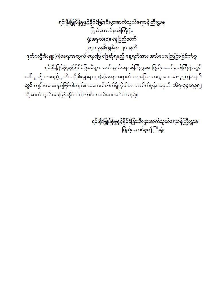 ရင်းနှီးမြှုပ်နှံမှုနှင့်နိုင်ငံခြားစီးပွားဆက်သွယ်ရေးဝန်ကြီးဌာန၊ ပြည်ထောင်စုဝန်ကြီးရုံး၊ ဒုတိယဦးစီးမှူး (၈) နေရာအတွက် ရေးဖြေ ဖြေဆိုရမည့် နေ့ရက်အား အသိပေးကြေငြာခြင်း Post on 28 June 2021