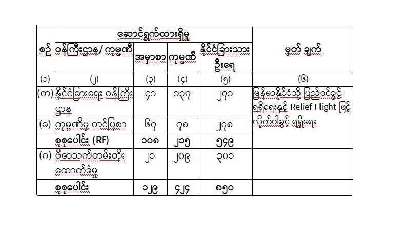 မြန်မာနိုင်ငံတွင်မှတ်ပုံတင်ထားသည့် ကုမ္ပဏီများ၊ ကုမ္ပဏီများနှင့်အကျိုးတူ ပူးပေါင်း လျက်ရှိသည့် ကုမ္ပဏီများ၊ ဝန်ကြီးဌာနများနှင့် ပူးတွဲအကောင် အထည်ဖော်လျက်ရှိသည့် ကုမ္ပဏီအဖွဲ့အစည်းများမှ ဒါရိုက်တာ၊ ရှယ်ယာရှင်၊ ကျွမ်းကျင်ပညာရှင်ဝန်ထမ်းများနှင့် မိသားစုဝင်များသည် COVID-19 ကပ်ရောဂါကြောင့် နိုင်ငံတကာလေယာဉ်များ ဝင်ရောက်ခွင့် ပိတ်ထားသည့် ကာလအတွင်း သက်ဆိုင်ရာ နိုင်ငံအသီးသီးမှ မြန်မာနိုင်ငံသို့ လာရောက်နိုင်ရန် ပြည်ဝင်ဗီဇာ ရရှိရေးနှင့် Relief Flight ဖြင့် လိုက်ပါခွင့် ရရှိရေးအတွက် နိုင်ငံခြားရေး ဝန်ကြီးဌာနမှ သဘောထားမှတ်ချက် တောင်းခံလာခြင်းနှင့် ကုမ္ပဏီများမှ အမှာစာတင်ပြခြင်း များအား လက်ခံဆောင်ရွက်လျက်ရှိပါသည်။