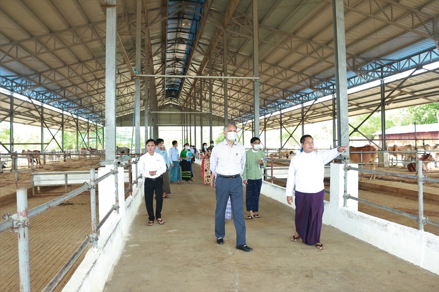 ဆက်လက်၍ ပြည်ထောင်စုဝန်ကြီးသည် မြန်မာနိုင်ငံရင်းနှီးမြှုပ်နှံမှုကော်မရှင်၏ ခွင့်ပြုမိန့်ဖြင့်ဆောင်ရွက်လျက်ရှိသော မကွေးခရိုင်၊ မြို့သစ်မြို့နယ်၊ ရေပြည့်ကျေးရွာအုပ်စုရှိ ရာနှုန်းပြည့် မြန်မာနိုင်ငံသားရင်းနှီးမြှုပ်နှံမှုလုပ်ငန်းဖြစ်သော Good Brothers’ Co.,Ltd ၏ နွားသားစပ်မွေးမြူခြင်းနှင့် ရောင်းချခြင်းလုပ်ငန်းသို့ ရောက်ရှိစဉ် ကုမ္ပဏီ၏ အရောင်းတာဝန်ခံ ဉီးမျိုးမြင့်ထွန်းက လုပ်ငန်းဆောင်ရွက်နေမှု အခြေအနေများနှင့် ရင်းနှီးမြှုပ်နှံမှုဆိုင်ရာ ကိစ္စရပ် များကို ရှင်းလင်းတင်ပြခဲ့ရာ ပြည်ထောင်စုဝန်ကြီးက လုပ်ငန်းများတိုးချဲ့ဆောင်ရွက်နိုင်ရေး၊ ဒေသခံတောင်သူများနှင့်နွားမွေးဖက်ပေးလုပ်ငန်းများချဲ့ထွင်ဆောင်ရွက်နိုင်ရေး၊ အခြားမြို့နယ် များသို့လည်းနွားမွေးမြူရေးတိုးချဲ့ဆောင်ရွက်နိုင်ရေးနှင့် ပြည်ပသို့ တိုးချဲ့တင်ပို့နိုင်ရေး တို့နှင့် စပ်လျဉ်း၍ ပြောကြားခဲ့ပြီး လိုအပ်သည်များ ဆွေးနွေးပေါင်းစပ်ညှိနှိုင်းပေးကာ မွေးမြူရေးခြံ အတွင်း လှည့်လည် ကြည့်ရှုအားပေးခဲ့ပါသည်။