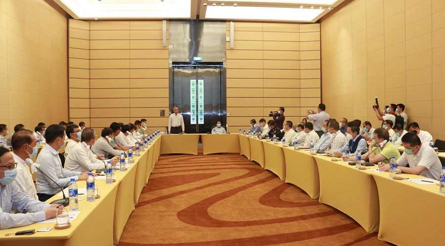ဤသို့ တွေ့ဆုံရာတွင် ပြည်ထောင်စုဝန်ကြီးက လက်ရှိ မြန်မာနိုင်ငံ၏ ဖြစ်ပေါ် ပြောင်းလဲနေသည့် အခြေအနေများသည် လိုအပ်ချက်အရ ပေါ်ပေါက်လာခြင်း ဖြစ်ပါ ကြောင်း၊ နိုင်ငံရေး အပြောင်းအလဲတွင် နိုင်ငံ၏ စီးပွားရေးထိခိုက်မှု မရှိစေရေးအတွက် နိုင်ငံတော်အစိုးရနှင့် စီးပွားရေးလုပ်ငန်းရှင်များအားလုံး လက်တွဲပြီး ပူးပေါင်းဆောင်ရွက် သွားရန်လိုကြောင်း၊ မြန်မာနိုင်ငံ၏ စီးပွားရေးသည် ကိုဗစ်-၁၉ ကပ်ရောဂါဖြစ်ပွားမှုကြောင့် ဆုတ်ယုတ်ကျဆင်းခဲ့ကြောင်း၊ နိုင်ငံတော်၏ စီးပွားရေးပြန်လည် တည့်မတ်ရေးအတွက် အစိုးရနှင့် လုပ်ငန်းရှင်များ အားလုံးပူးပေါင်းဆောင်ရွက်မှသာ ကာလတိုအတွင်း စီးပွားရေး ပြန်လည် ဦးမော့လာမည်ဖြစ်ပါကြောင်း၊ နိုင်ငံတော်စီမံအုပ်ချုပ်ရေးကောင်စီ အနေဖြင့်လည်း ရှေ့ဆက်လက်ဆောင်ရွက်မည့် လုပ်ငန်းစဉ်များကို ရှင်းလင်းစွာ ချပြထားပြီး ဖြစ်သည့်အပြင် ဦးတည်ချက်များကိုလည်း ချမှတ်ပေးထားပြီးဖြစ်ပါကြောင်း၊ အဆိုပါ ဦးတည်ချက်များ အနက်မှ စီးပွားရေးဆိုင်ရာ ဦးတည်ချက်ကို ပြန်လည်သုံးသပ်ကြည့်လျှင် နိုင်ငံတော်၏ ပကတိ အခြေအနေအရ ချက်ချင်းစတင် လည်ပတ်ဆောင်ရွက်နိုင်မည့် စိုက်ပျိုးရေးနှင့် မွေးမြူရေးလုပ်ငန်းများကို ဦးစားပေးထားသည်ကို တွေ့ရှိရသည့်အပြင် နိုင်ငံသားစီးပွားရေး လုပ်ငန်းရှင်များ ဖွံ့ဖြိုးတိုးတက်မှုအတွက် ဆက်လက်ဆောင်ရွက်မည့် အစီအစဉ်များကို အတိအလင်း ဖော်ပြထားပြီးဖြစ်ကြောင်း၊ နိုင်ငံတော်အစိုးရ၏ အစီအစဉ်ဖြင့် ရင်းနှီးမြှုပ်နှံမှု နှင့် နိုင်ငံခြားစီးပွားဆက်သွယ်ရေး ဝန်ကြီးဌာနက ဦးဆောင်ပြီး စီးပွားရေးလုပ်ငန်းများ လုပ်ကိုင်ဆောင်ရွက်ရာတွင် မလိုအပ်သည့် လုပ်ငန်းအဆင့်များ လျော့ချရေး၊ အစိုးရဌာန အသီးသီးနှင့် ဆက်သွယ် ဆောင်ရွက်ရာတွင် လွယ်ကူချောမွေ့စွာဖြင့် မြန်ဆန်သွက်လက် အောင် ဆောင်ရွက်နိုင်ရေး၊ လုပ်ငန်းရှင်များအနေဖြင့် ဌာနဆိုင်ရာ အသီးသီးမှ ချမှတ်ကျင့်သုံး နေသည့် စည်းမျဉ်းစည်းကမ်းများအနက် အချို့သော လုပ်ထုံး လုပ်နည်းများ၊ စည်းမျဉ်းများက ဝန်ထုပ်ဝန်ပိုးသဖွယ်ဖြစ်နေခြင်းကို လျော့ချပေးရေး စသည်တို့ကို ပြန်လည်သုံးသပ်ကာ လိုအပ်သလို ပြင်ဆင်နိုင်ရေး ဦးစားပေး ဆောင်ရွက်လျက်ရှိကြောင်း၊ လတ်တလော အနေအထားတွင် နိုင်ငံအတွင်းရှိသည့် လူထုအနေဖြင့် လှုံ့ဆော်မှုများကြောင့် ဘဏ်များ အပေါ် ယုံကြည်မှု ကျဆင်းကာ မိမိတို့ အပ်နှံထားသည့် ငွေများကို ပြန်လည်ထုတ်ယူမှုများ ဖြစ်ပေါ်နေသည်ကို တွေ့ရကြောင်း၊ နိုင်ငံတော်အစိုးရနှင့် မြန်မာနိုင်ငံတော် ဗဟိုဘဏ်တို့က လိုအပ်သည့် အစီအမံများ ချမှတ်ပြင်ဆင်လျက်ရှိသဖြင့် ဘဏ်များနှင့် ပတ်သက်၍ လုပ်ငန်းရှင်များအနေဖြင့် စိတ်ပူပန်ရန်မလိုဘဲ 